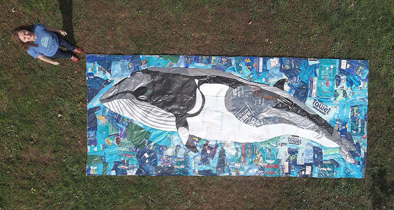 Artist and researcher Katharine Owens, a professor of Politics, Economics, and International Studies at the University of Hartford, is creating a series of durable, hand-sewn, life-sized murals of sea animals harmed by plastic pollution created from non-recyclable plastics. The largest one she has done so far is a 60- by 20-foot sperm whale. “Part of the story I’m trying to tell with the art project is about the way we frame the issue of plastic pollution in the scientific literature,” Owens said.