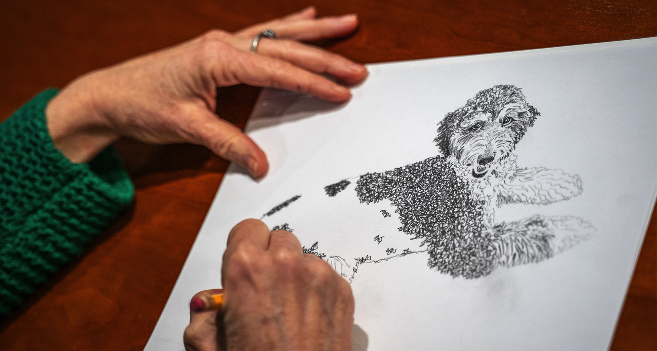 I came home that day and curled up on the couch when RocketBear, our family dog, jumped up next to me, and he was just so comforting. It sounds stupid, but I looked at him, and I thought, “He has no idea what's going on. Look at his eyes. They’re so peaceful. They’re the same as they were yesterday.” I picked up my pencil and started doodling him and found a moment of peace on an otherwise really dark day.