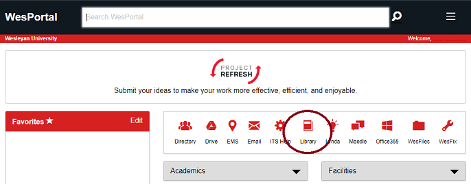 Wesleyan alumni have access to a subset of online library resources. For access, log into WesPortal and click the Library icon. If you do not have a WesID for accessing WesPortal please contact ITS for assistance.