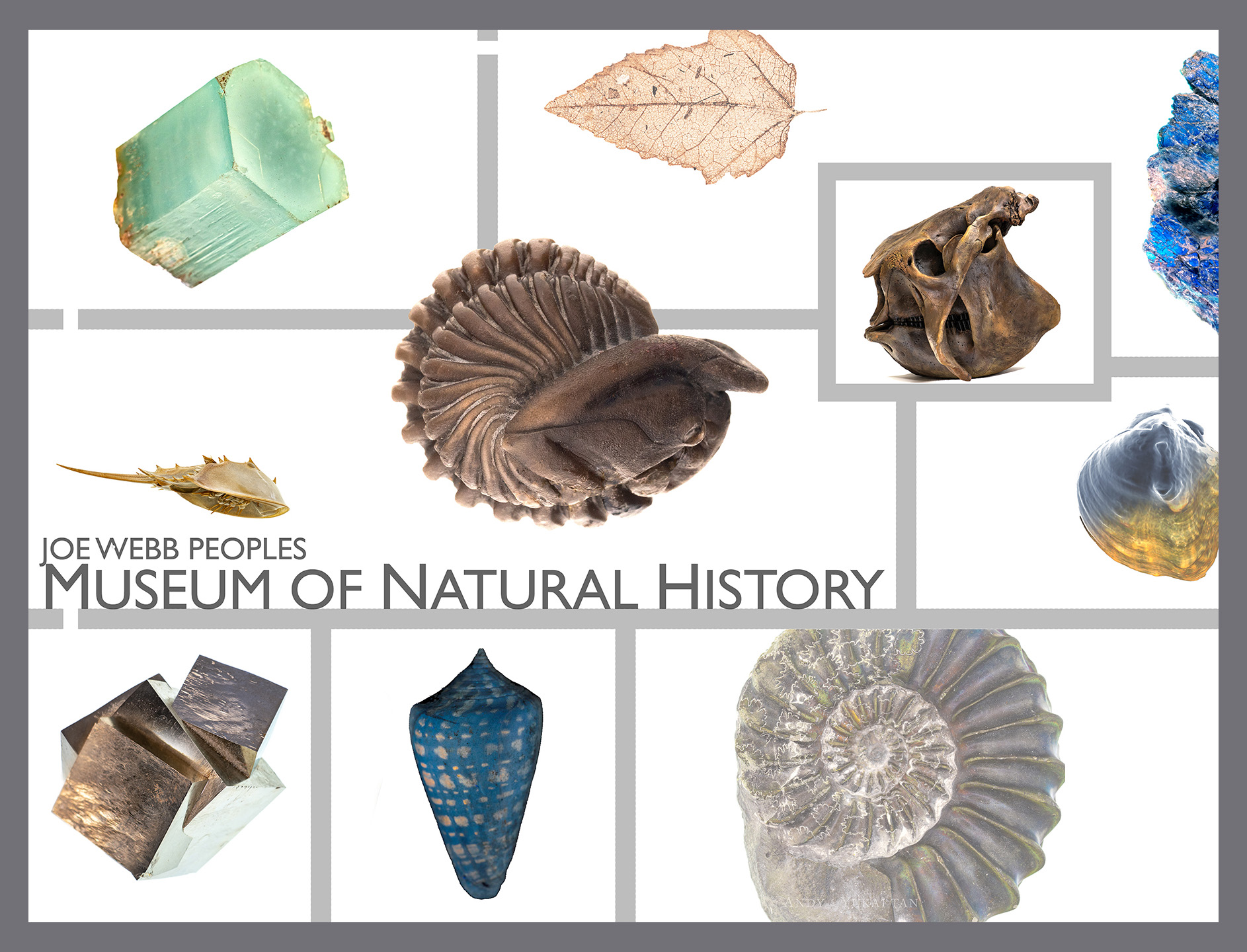 The Joe Webb Peoples Museum of Natural History has unique collections of fossils from localities with unusually good preservation, such as the Triassic-Jurassic fossils of the Connecticut River Valley, the amazing fish and plants from the Eocene Green River Formation (Wyoming) and Florissant (Colorado), the Paleozoic Burgess Shale with its strange life forms (British Columbia) and many Sea Lilies from Crawfordsville (Indiana). The Museum has an extensive collection of rocks and minerals, including the large and beautiful crystals from Connecticut pegmatites from the Glastonbury-Portland area, as well as meteorites. Visit our exhibits at other locations: Shelley the Glyptodon at the Science Library, Terry the Deinotherium at the Woodhead Lounge, and our Mosasaur skull in Olin Library.