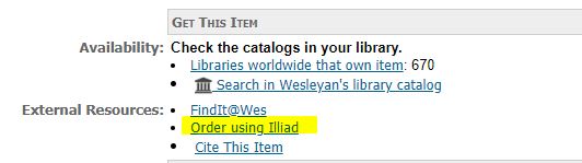 To obtain materials (books, scans of articles or chapters, DVDs, etc.) that are not available through OneSearch, you can place an interlibrary loan (ILL) request. Submit a request right in OneSearch or in most databases. Interlibrary loan is available to current Wesleyan faculty and staff, and enrolled students.