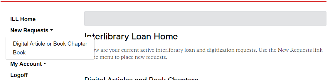 ILL: You can place a request directly in your ILL account under New Request.