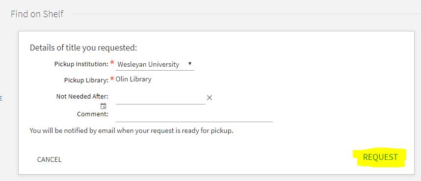 Faculty, staff, and students may request Wesleyan library items that are currently available on the shelf to pick up in the Olin or Science Library. Use the Request link in OneSearch.